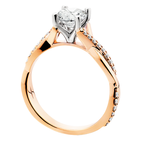 From the Finelli Bridal Collection add a delicate touch of sparkle with this stylish and fashionable engagement ring, embellished with a row of .21tw shimmering white diamonds that crossover the sides of the shank. This stunning ring is crafted in 14k rose gold and is as unique and impressive as she is. Show her just how much you care. (center stone sold separately) See matching wedding band 9691DW-6.5.